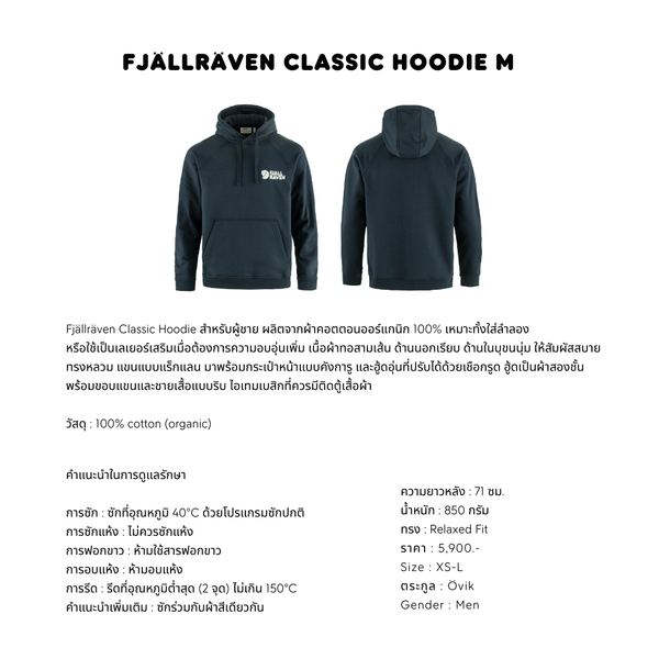 Fjällräven Classic Hoodie M คือ เสื้อฮู้ดทรงคลาสสิก สำหรับผู้ชาย ผลิตจากผ้าฝ้ายออร์แกนิก 100% จะใส่เป็นเสื้อลำลอง หรือใส่เป็นเสื้อคลุมเมื่อต้องการความอบอุ่นเพิ่มขึ้นก็ได้