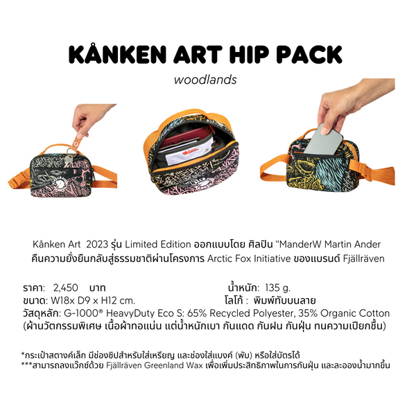 Kånken Art Hip Pack ‘23 ในปีนี้ออกแบบโดยศิลปินชาวสวีเดน Martin Ander ที่โดดเด่นในเรื่องของการวาดภาพประกอบ กราฟิกดีไซน์ มีลายเส้นที่เป็นสไตล์เป็นของตัวเอง ในรูปแบบของศิลปะในแบบ urban skateboard style ที่มีลายเส้นที่เป็นตัวตนของเขาอย่างชัดเจน ผสมผสานกับการสื่อถึงธรรมชาติ ออกมาเป็นลวดลายที่สะท้อนรายละเอียดของสรรพสิ่งในผืนป่า ไม่ว่าจะเป็น ใบไม้ ไม้ ไลเคน และมอส ฯลฯ