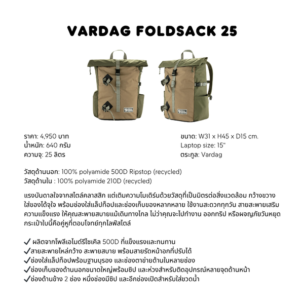 ได้รับแรงบันดาลใจมาจากกระเป๋านักเรียนยุค 90s ดีไซน์เหนือกาลเวลาของแค็ตตาล็อกคลาสสิก และผลิตจากวัสดุสมัยใหม่ที่เป็นมิตรต่อสิ่งแวดล้อม Vardag Foldsack 25 เป็นกระเป๋าเดย์แพ็คที่กว้างขวางและทนทาน พร้อมสำหรับการผจญภัยนับครั้งไม่ถ้วน ออกแบบเพื่อความสะดวกสบายในการใช้งานด้วยสายสะพายไหล่เสริมความแข็งแรงและพื้นที่จัดเก็บที่เพียงพอสำหรับอุปกรณ์ต่างๆ